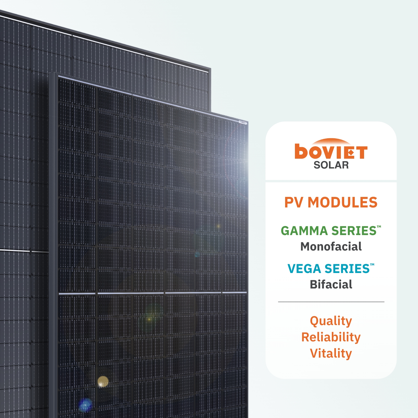 Boviet Solar’s PV Module Brand Images provide high-quality, studio-style visuals of our Gamma SeriesTM Monofacial and Vega SeriesTM Bifacial modules, designed to support product presentations, marketing materials, sales collateral, and technical documentation. These images showcase the professional look, design precision, and engineering excellence of our modules, helping partners and customers clearly visualize the craftsmanship and reliability behind Boviet Solar’s PV technology.